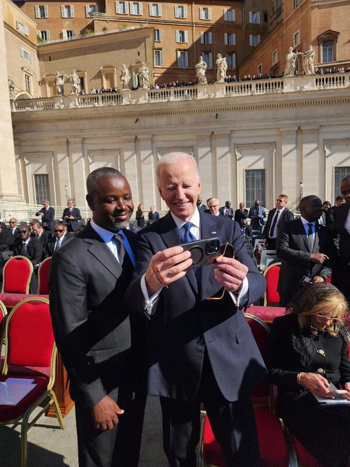 وفي الصورة، يظهر بايدن مع الرئيس الكيني ويليام روتو في ساحة القديس بطرس بمدينة الفاتيكان، خلال جنازة البابا فرانسيس مبتسماً كما التقط صورة مع رئيسة البرلمان أنيتا أمونغ، ونائبها توماس تايبوا، ومسؤولون حكوميون أوغنديون آخرون.