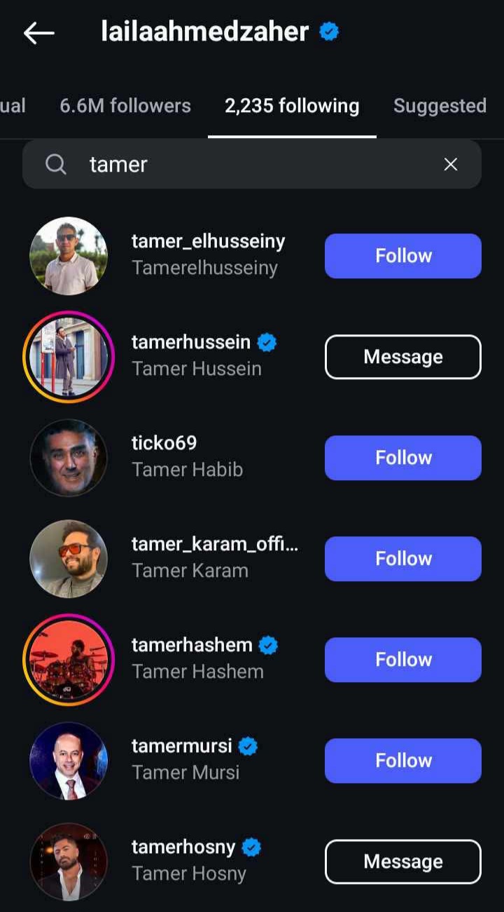 ولكن مع البحث تبين أن ليلى زاهر لم تقم بعمل unfollow لتامر حسني، فهي مازالت تتابعه وهو كذلك مازال يتابعها، وفقا لما رصده موقع تحيا مصر.