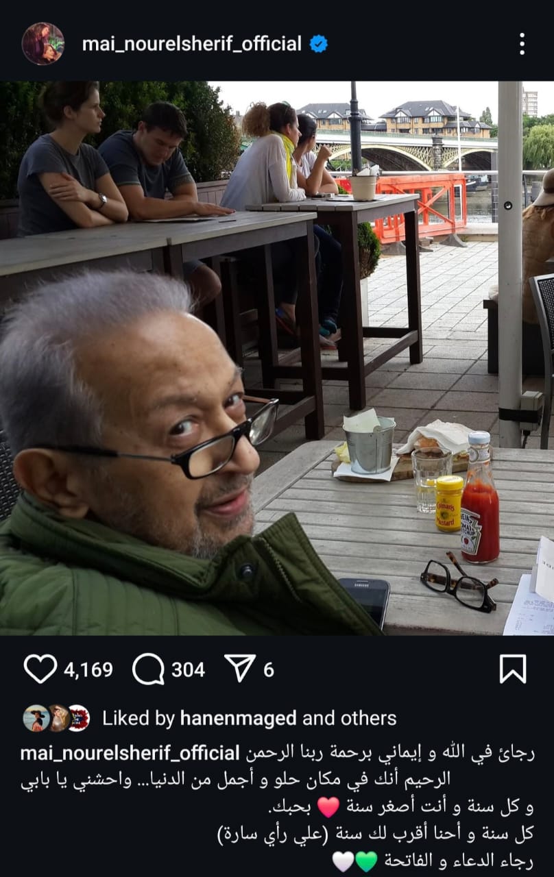 وكتبت مي نور الشريف عبر حسابها بموقع انستجرام: واحشني جدا، نفسي أقعد معاك وأحضنك وأحكي لك حاجات كثيرة وآخد رأيك، الحمد لله على أنك في حياتي. حضرتك علمتنا حاجات كثير في الحياة والفن والناس، خلت حياتنا أنا وسارة مميزة ونظرتنا للحياة مختلفة، حتى ذوقنا، حضرتك أكرمتنا في حياتك وربنا كرمنا بسيرتك الحلوة وحب الناس ليك، أنا فخورة إنك أبويا. أتمني تكون فخور إني بنتك، إيماني بالله أنك في مكان أحسن. عيدك في الجنة بإذن الله برحمته وكرمه، بنتك مي.