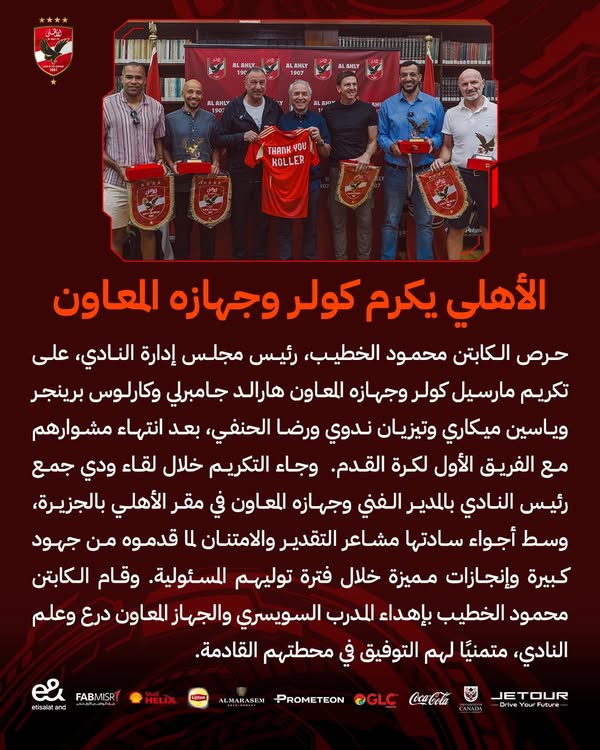 وتابع البيان، وجاء التكريم خلال لقاء ودي جمع رئيس النادي بالمدير الفني وجهازه المعاون في مقر الأهلي بالجزيرة وسط أجواء سادتها مشاعر التقدير والامتنان لما قدموه من جهود كبير وإنجازات مميزة خلال فترة توليهم المسئولية.