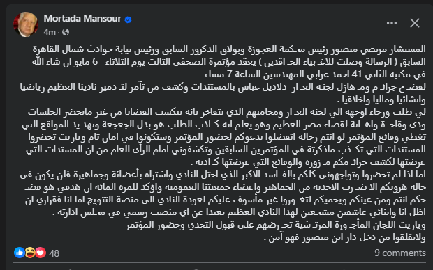 تحيا مصر، وكتب مرتضي منصور عبر حسابه الرسمي"فيس بوك":المستشار مرتضي منصور رئيس محكمة العجوزة وبولاق الدكرور السابق ورئيس نيابة حوادث شمال القاهرة السابق ( الرسالة وصلت للاغـبياء الحـاقدين ) يعقد مؤتمرة الصحفي الثالث يوم الثلاثاء 6 مايو ان شاء اللة، في مكتبه الثاني 41 احمد عرابي المهندسين الساعة 7 مساءً".