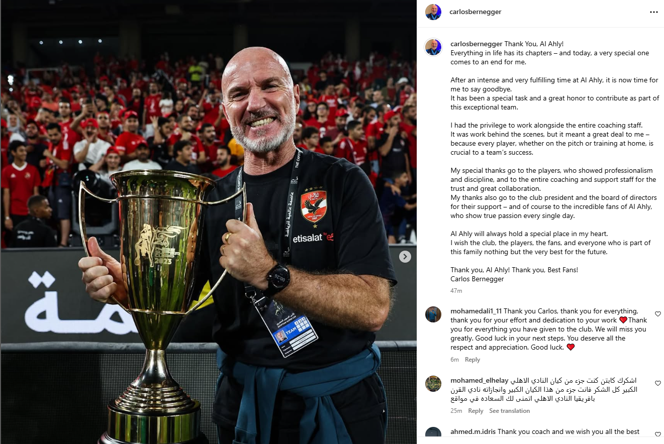 تحيا مصر، وكتب كارلوس بيرنيجر عبر حسابه الرسمي" إنستجرام":شكرًا يا أهلي، اليوم ينتهي فصل مميز من مسيرتي بعد فترة رائعة ومليئة بالفخر مع النادي الأهلي".