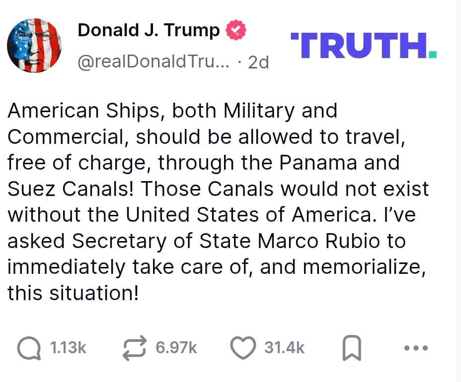 في 26 أبريل، طالب ترامب علنًا بالسماح للسفن الأميركية بالمرور مجانًا عبر قناتي السويس وبنما، مبررًا ذلك بالدعم التاريخي الأميركي لهما.