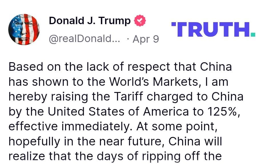 اتخذت تغريدات ترامب منحى أكثر خطورة تجاه الصين، حيث هدّد في 7 أبريل بفرض رسوم جمركية بنسبة 50%، ثم رفعها إلى 125% بعد يومين فقط، متهماً بكين بـ"الاحتيال التجاري".