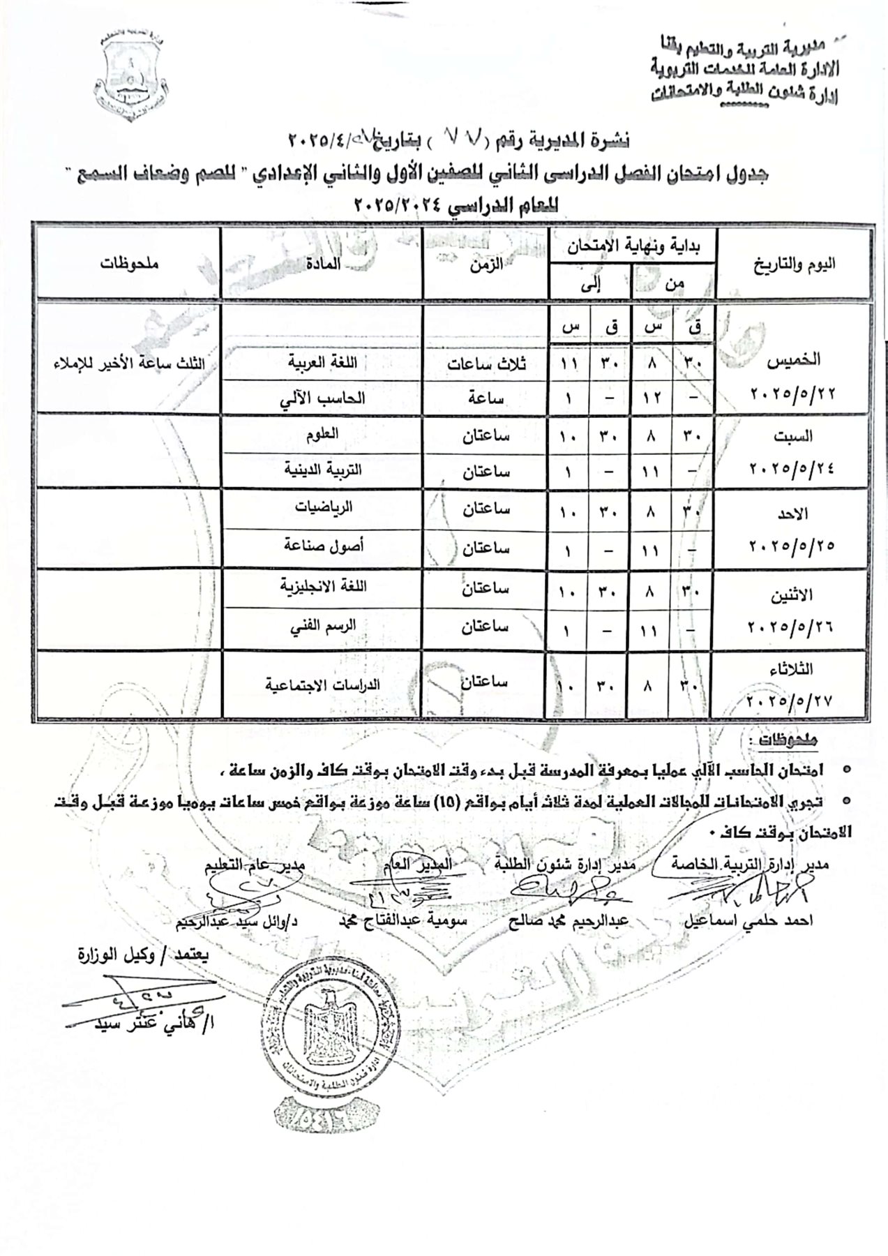 أما امتحانات الشهادة الإعدادية العامة والمهنية، فتبدأ من السبت الموافق 31 مايو 2025 وتستمر حتى الأربعاء 4 يونيو 2025.