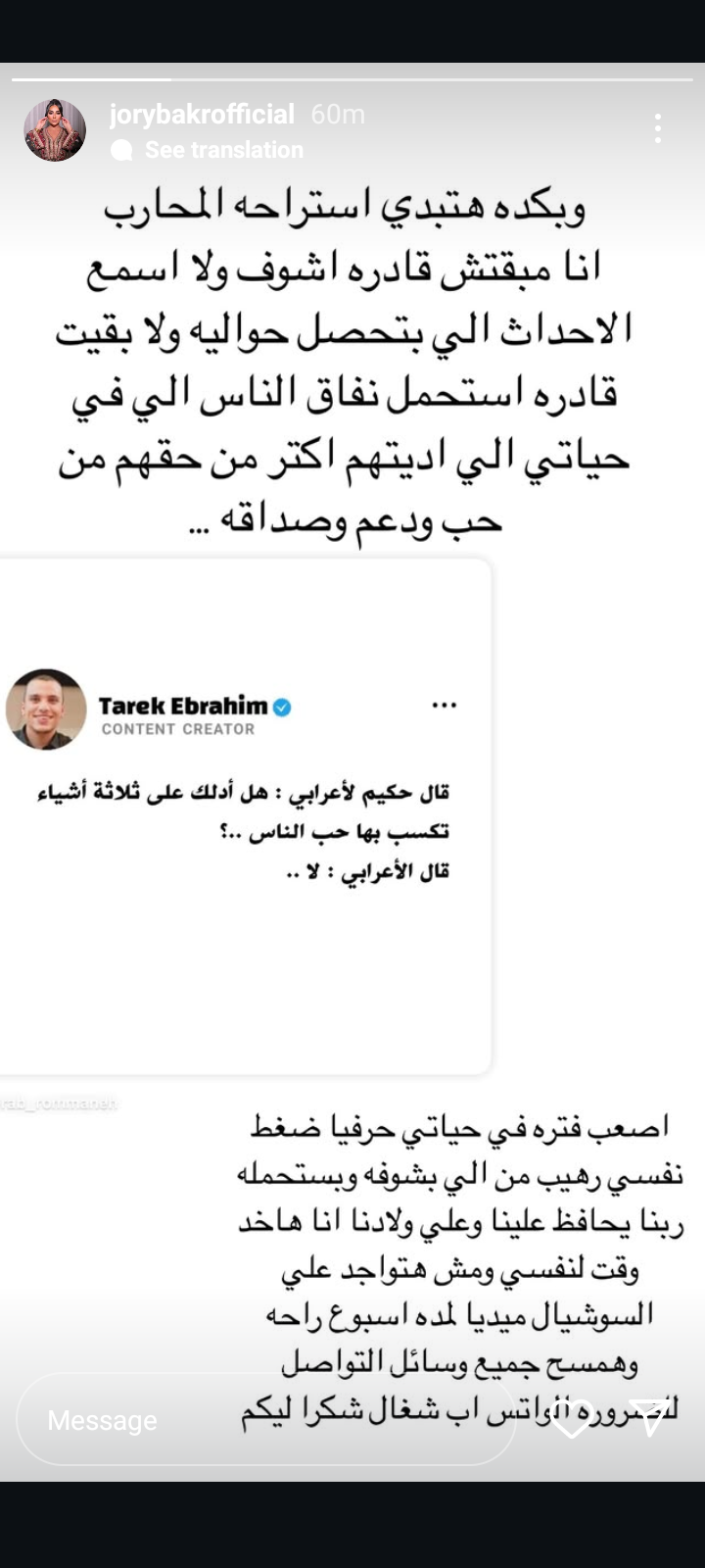 وتابعت جوري بكر حديثها: وبكدة هبتدي استراحة المحارب، أنا مبقتش قادرة أشوف ولا أسمع الأحداث اللي بتحصل حواليا، ولا بقيت قادرة أستحمل نفاق الناس اللي في حياتي، اللي اديتهم أكتر من حقهم من حب ودعم وصداقة.