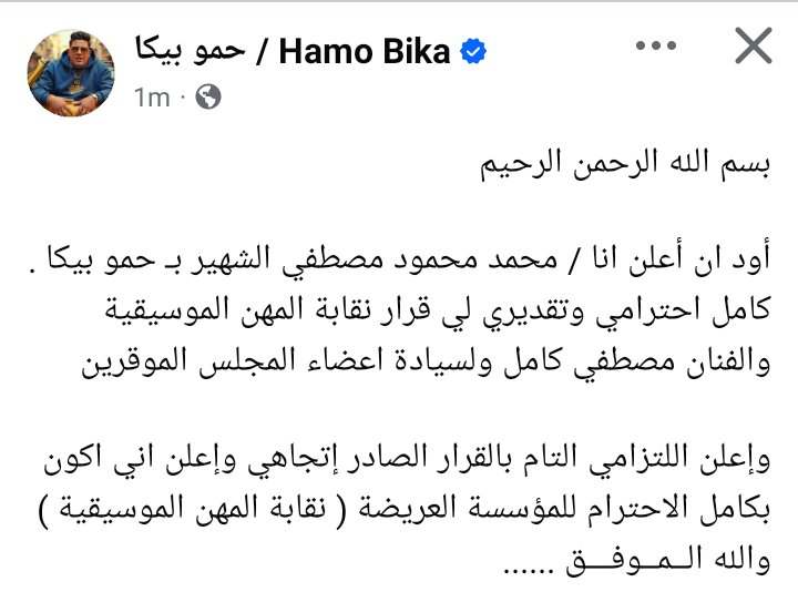 وكتب حمو بيكا في منشور رصده موقع تحيا مصر عبر حسابه الرسمي بموقع التواصل الاجتماعي فيسبوك: أود ان أعلن انا / محمد محمود مصطفي الشهير بـ حمو بيكا كامل احترامي وتقديري لي قرار نقابة المهن الموسيقية والفنان مصطفي كامل ولسيادة اعضاء المجلس الموقرين.