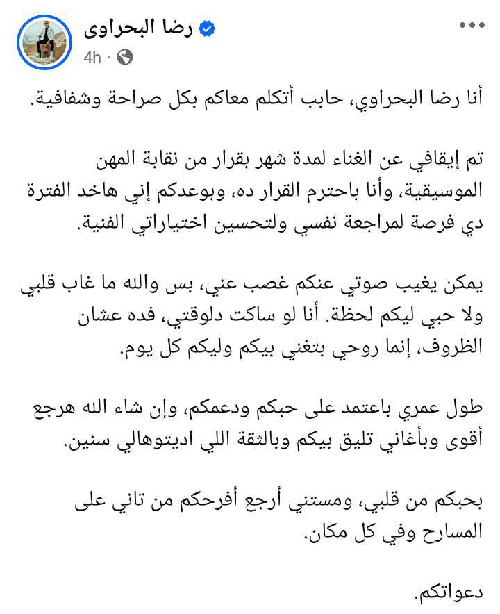 وكتب رضا البحراوي في منشور رصده موقع تحيا مصر عبر حسابه الرسمي بموقع التواصل الاجتماعي فيسبوك: أنا رضا البحراوي، حابب أتكلم معاكم بكل صراحة وشفافية، تم إيقافي عن الغناء لمدة شهر بقرار من نقابة المهن الموسيقية، وأنا باحترم القرار ده، وبوعدكم إني هاخد الفترة دي فرصة لمراجعة نفسي ولتحسين اختياراتي الفنية.