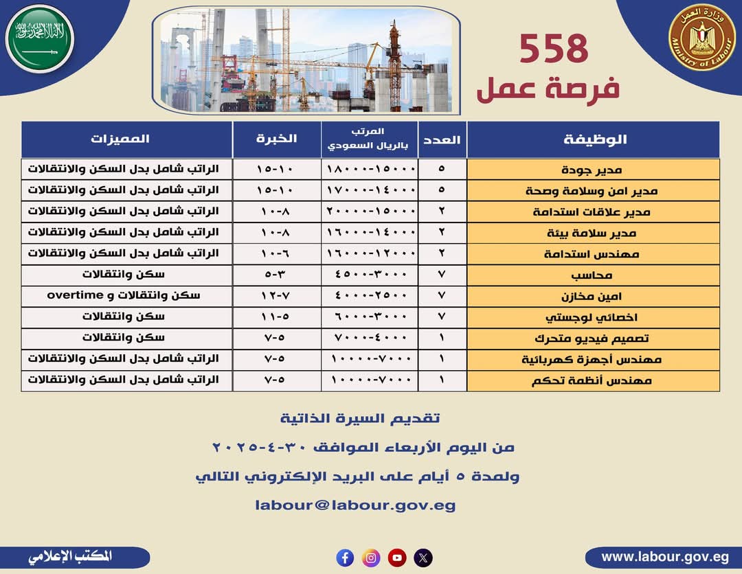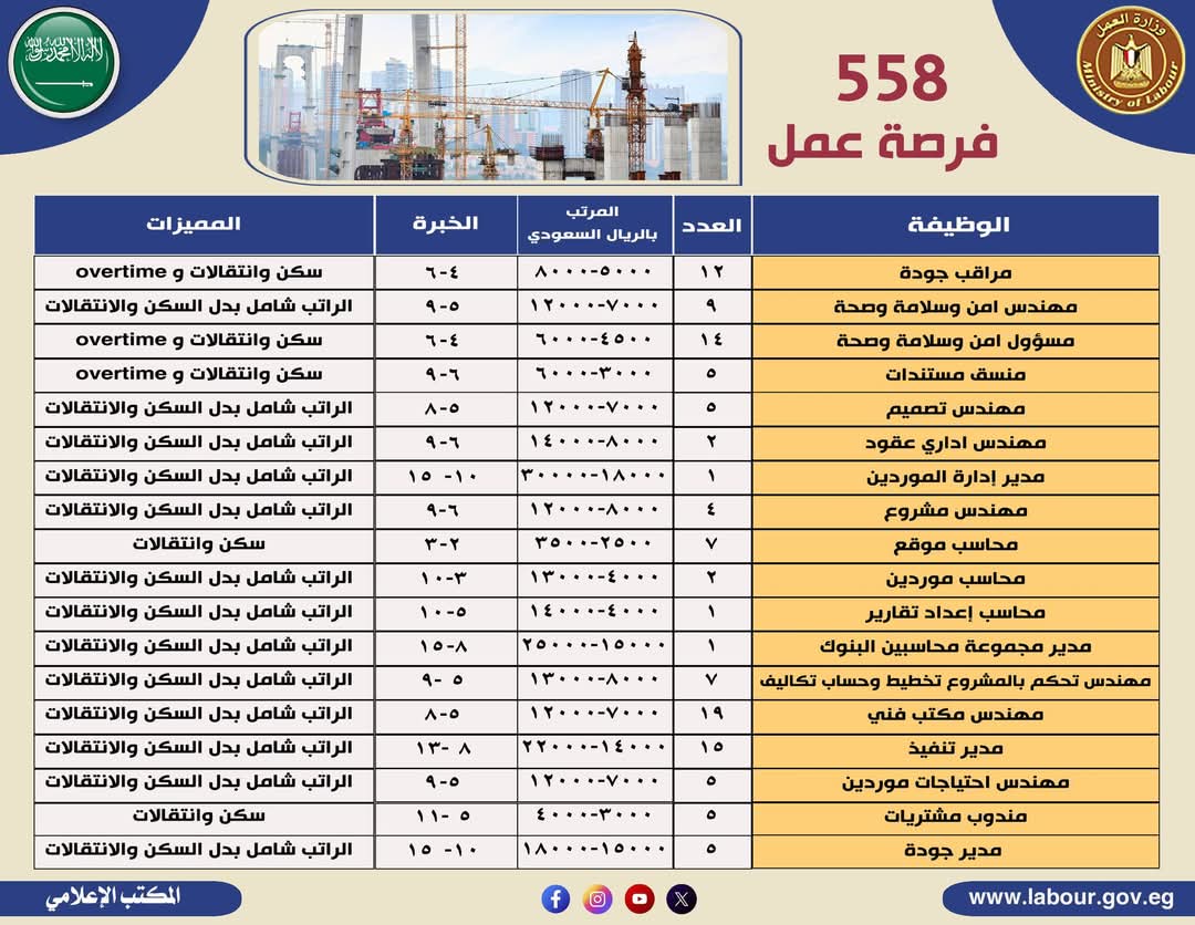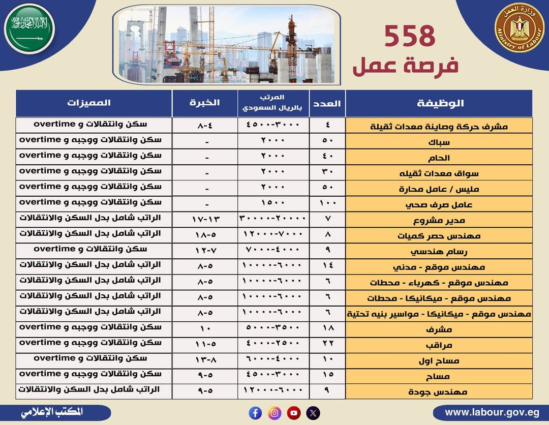 وفى السطور القادمة يستعرض لكم موقع تحيا مصر وظائف للمهندسين بالسعودية التى أعلنت عنها وزارة العمل بالرواتب والمميزات الخاصة بكل وظيفة مع العدد المطلوب.