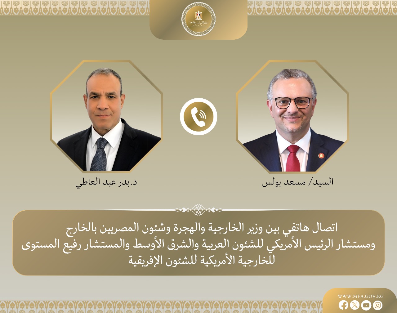وخلال الاتصال ناقشا العلاقات الثنائية المصرية-الأمريكية والشراكة الاستراتيجية الممتدة بين البلدين، وما تحققه من مصالح متبادلة في مختلف المجالات، إلى جانب المساعى المشتركة لتحقيق السلام والأمن في الشرق الأوسط وأفريقيا.