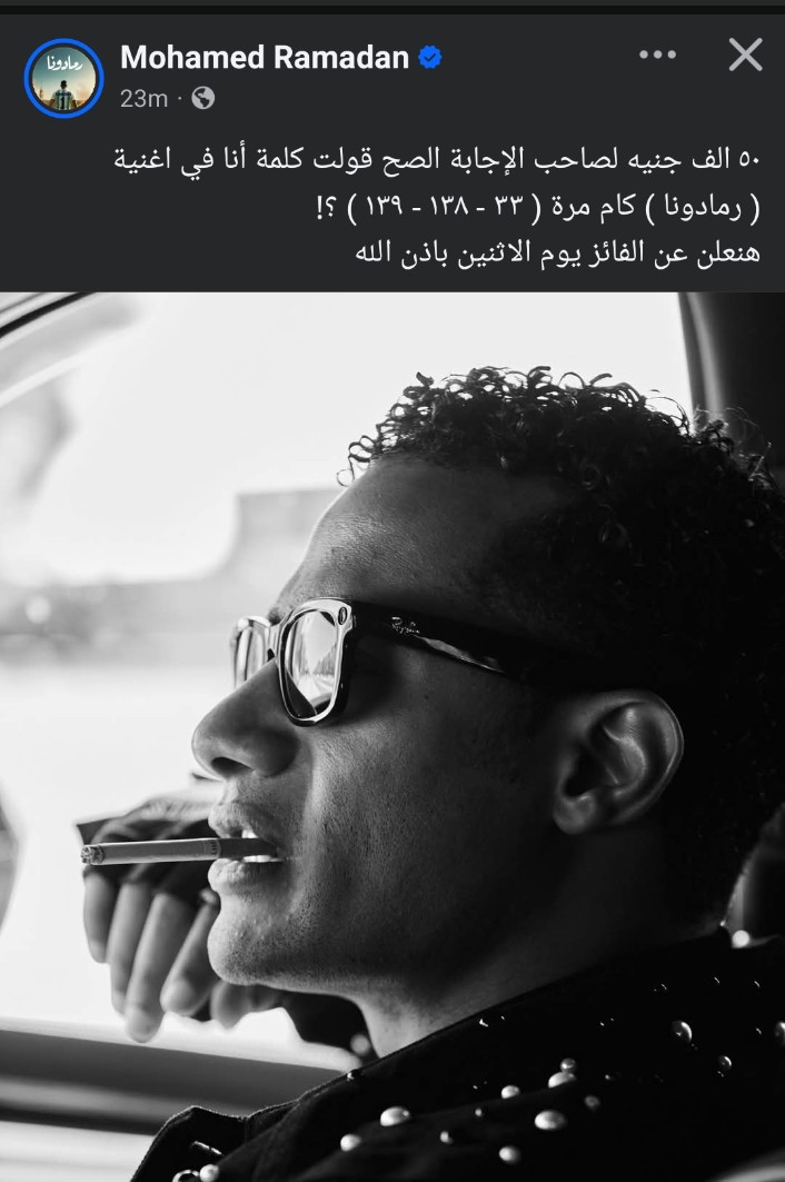 أعلن الفنان محمد رمضان عن طرح مسابقة جديدة يرصد تفاصيلها موقع تحيا مصر والجائزة قيمتها 50 ألف جنيه، وجاء سؤال مسابقة محمد رمضان عن أغنيته الجديدة رمادونا، ونشر محمد رمضان صورة جديدة له عبر حسابه الرسمي على موقع التواصل الاجتماعي فيسبوك وعلق عليها معلنًا تفاصيل المسابقة: "50 ألف جنيه لصاحب الإجابة الصح، السؤال هو قولت كلمة أنا في أغنية رمادونا كام مرة..وهنعلن عن الفائز يوم الإثنين إن شاء الله"، وانهالت التعليقات من متابعي محمد رمضان على منشوره عبر حسابه الرسمي على موقع التواصل الاجتماعي فيسبوك محاولين الوصول إلى الإجابة الصحيحة.