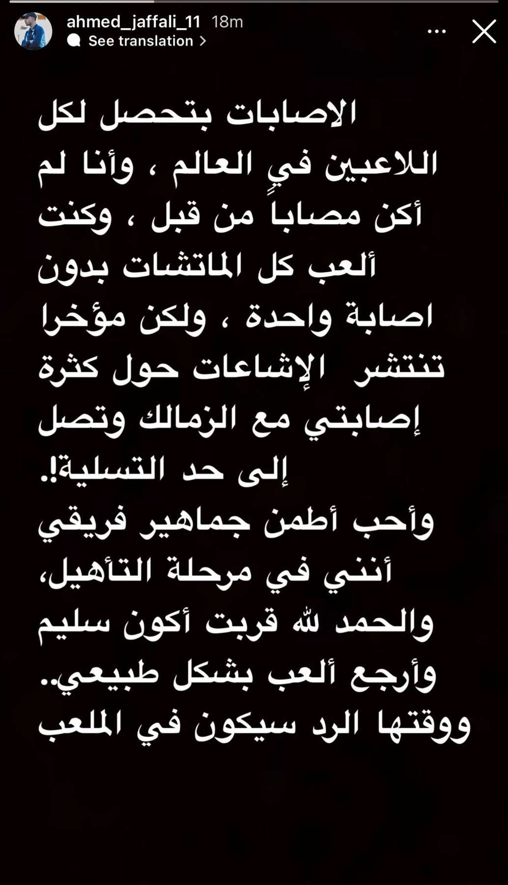 وقال الجفالي عبر ستوري خلال صفحته الرسمية بموقع التواصل الاجتماعي انستجرام: “الإصابات تحدث لكل اللاعبين في العالم، ولم أتعرض لأي إصابة طوال مسيرتي قبل انضمامي للزمالك، حيث كنت أشارك في جميع المباريات بشكل منتظم. لكن مؤخراً انتشرت شائعات حول إصابتي بشكل متكرر وصلت لحد السخرية”.