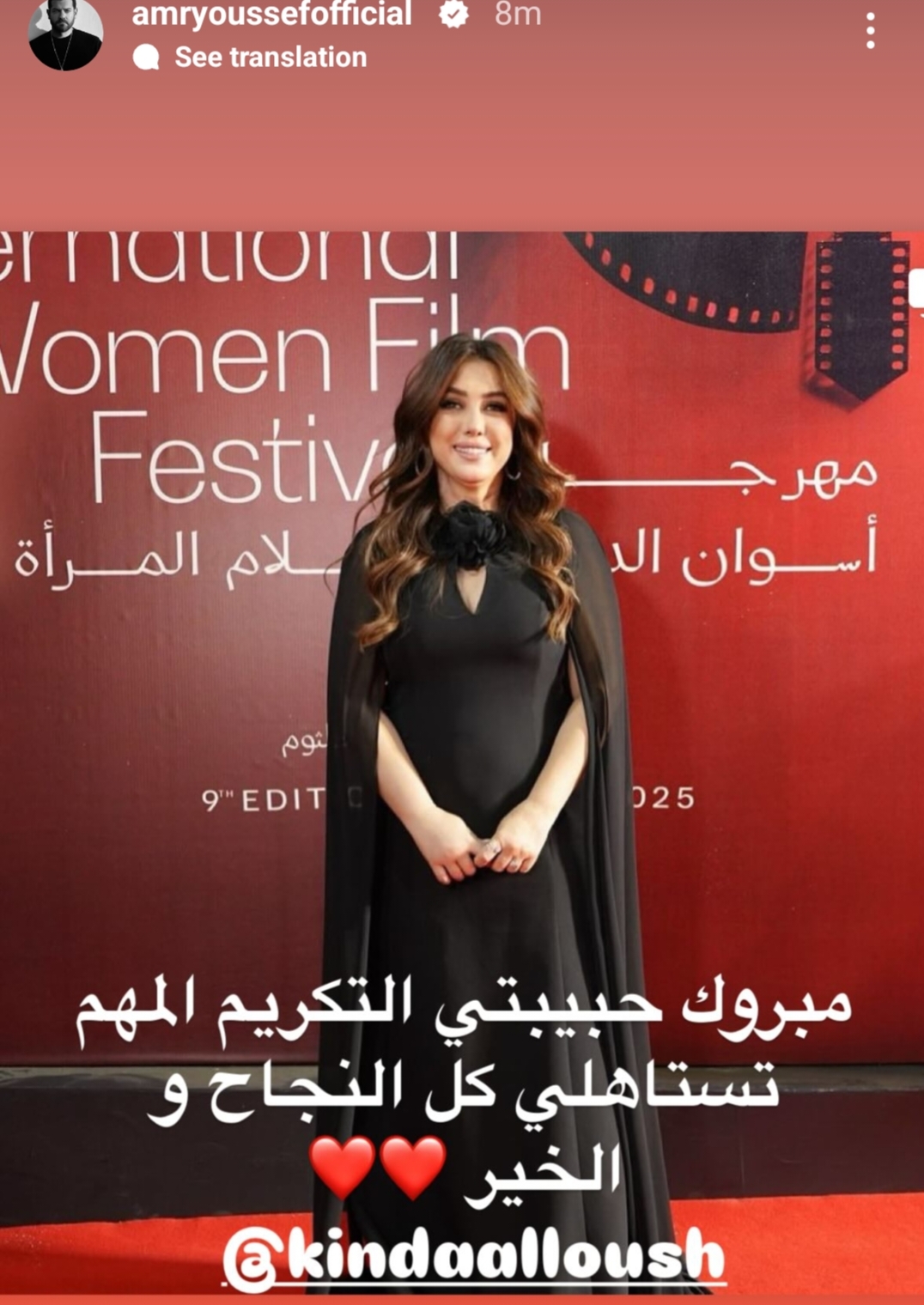 نشر الفنان عمرو يوسف صورة للفنانة كندة علوش من تكريمها في مهرجان أسوان الدولي لأفلام المرأة الدورة التاسعة وظهرت فيها بإطلالتها الجذابة، وعلق على الصورة معبرًا عن سعادته الكبيرة بتكريمها وفخره بها حيث كتب على الصورة التي يرصدها موقع تحيا مصر عبر حسابه الرسمي على موقع تبادل الصور والفيديوهات انستجرام: "مبروك ياحبيبتي التكريم المهم انتي تستاهلي كل النجاح والخير"، وتأتي رسالة عمرو يوسف لكندة علوش بعد ارتفاع تساؤلات الجمهور عن سبب غيابه عن تكريمها حيث من المعتاد ظهوره معها في جميع المناسبات لتقديم الدعم لها، ولكن كانت أكدت كندة علوش أن السبب هو انشغاله بالاستعدادت الأخيرة لفيلم درويش قبل طرحه بين أفلام عيد الأضحى 2025.