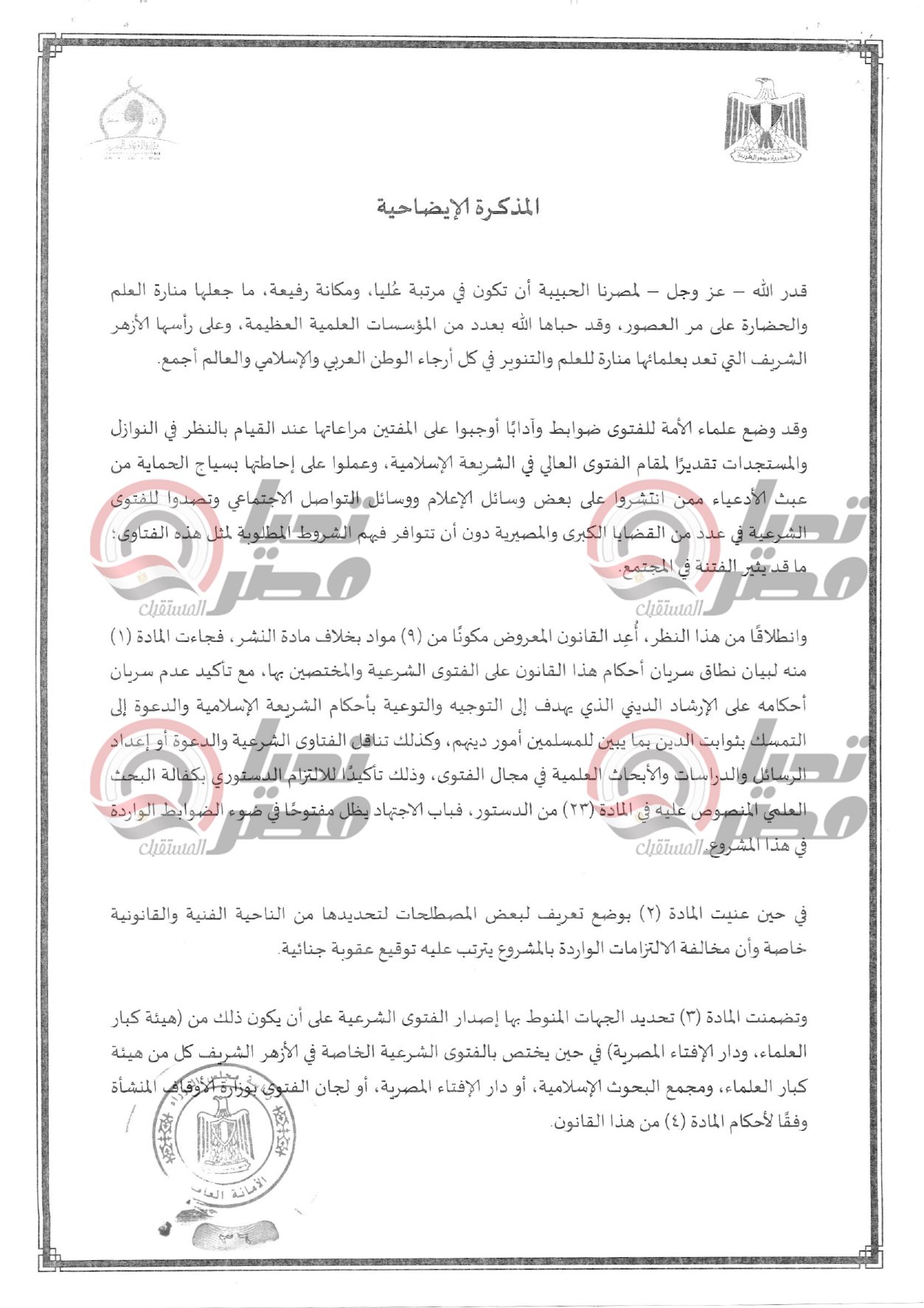 بعد رفض الأزهر.. تحيا مصر ينشر نص مشروع قانون إصدار الفتوى المعروض علي البرلمان..صور