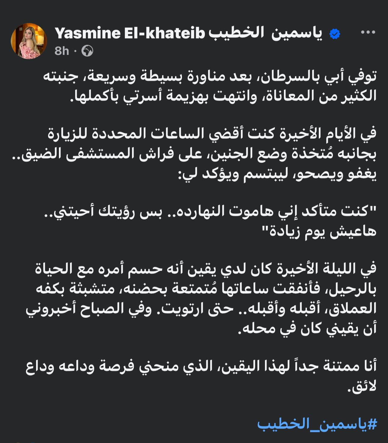 عبر منشور مؤثر شاركته مع متابعيها على منصات التواصل الاجتماعي، استرجعت الإعلامية والكاتبة ياسمين الخطيب تفاصيل اللحظات الأخيرة التي جمعتها بوالدها الراحل خلال فترة مرضه.