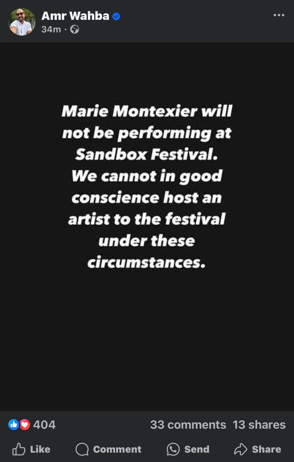 ورصد موقع تحيا مصر، منشور الفنان عمرو وهبة عبر حسابه الرسمي على فيسبوك: " لن تُحيي Marie Montexier حفلًا في مهرجان ساندبوكس، لا يمكننا بضميرٍ حيّ، استضافة فنانة في المهرجان في ظل هذه الظروف".