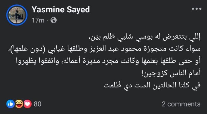 سواء كانت متجوزة محمود عبد العزيز وطلقها غيابي (دون علمها).. أو حتى طلقها بعلمها وكانت مجرد مديرة أعماله واتفقوا يظهروا أمام الناس كزوجين في كلتا الحالتين الست دي ظُلمت"، وانهالت التعليقات على منشور ياسمين الخطيب بين مؤيد ومعارض لرأيها ودعمها للإعلامية بوسي شلبي في أزمتها.