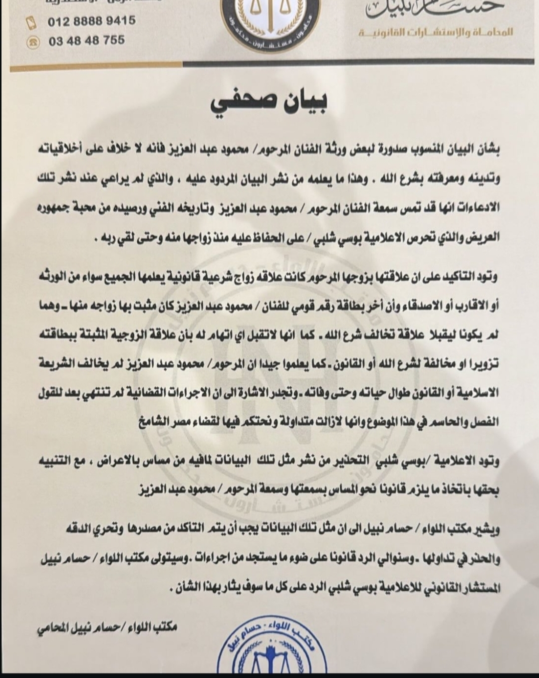 وتابع: “وتود الاعلامية / بوسي شلبي التحذير من نشر مثل تلك البيانات لما فيه من مساس بالاعراض ، مع التنبيه بحقها باتخاذ ما يلزم قانونا نحو المساس بسمعتها وسمعة المرحوم / محمود عبد العزيز، ويشير مكتب اللواء / حسام نبيل الى ان مثل تلك البيانات يجب أن يتم التأكد من مصدرها وتحري الدقه.. والحذر في تداولها وسنوالي الرد قانونا على ضوء ما يستجد من اجراءات . وسيتولى مكتب اللواء / حسام نبيل المستشار القانوني للاعلامية بوسي شلبي الرد على كل ما سوف يثار بهذا الشأن".
