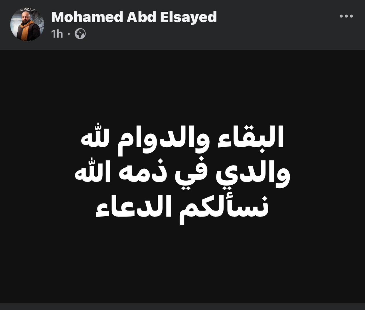 أعلن الفنان محمد عبد السيد منذ قليل عن وفاة والده، دون الإعلان عن موعد ومكان الجنازة.
