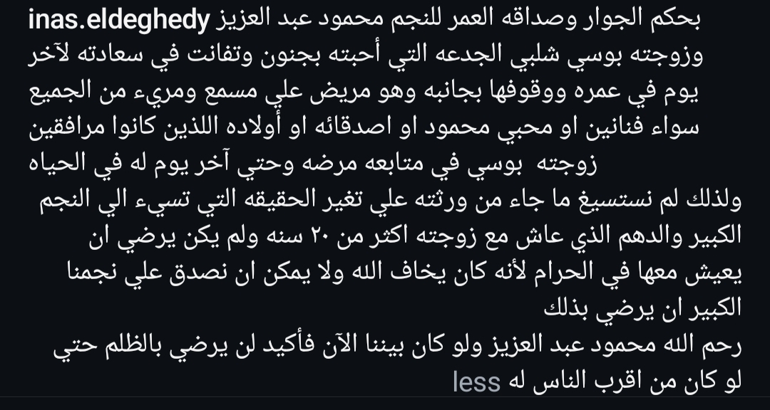 وتابعت: “ولذلك لم نستسيغ ما جاء من ورثته على تغير الحقيقه التي تسيء الي النجم الكبير والدهم الذي عاش مع زوجته أكثر من ٢٠ سنه ولم يكن يرضي ان يعيش معها في الحرام لأنه كان يخاف الله ولا يمكن ان نصدق علي نجمنا الكبير ان يرضي بذلك، رحم الله محمود عبد العزيز ولو كان بيننا الآن فأكيد لن يرضي بالظلم حتي لو كان من اقرب الناس له”.