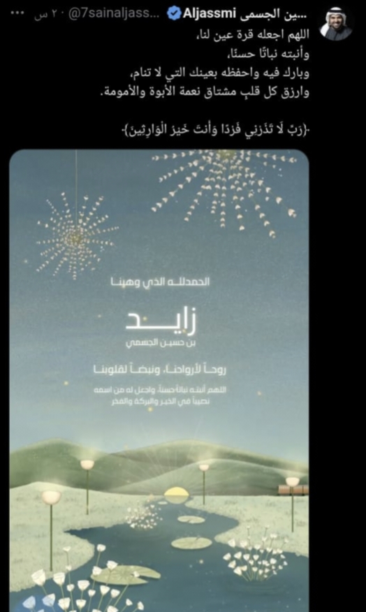 نشر الفنان حسين الجسيم منشور عبر حسابه على تطبيق اكس يعلن رزقه بمولود جديد سماه زايد، وبكلمات مؤثرة عبر عن فرحته وكتب وفقًا لما يرصده موقع تحيا مصر: "اللهم اجعله قرة عين لنا، وأنبته نبتًا حسنا وبارك فيه واحفظه بعينه التي لا تنام وأرزق كل قلب مشتاق نعمة الأمومة والأبوة، الحمدلله الذي وهبنا زايد بن حسين الجسمي"، وانهالت التعليقات على منشور حسين الجسمي من محبيه ومتابعينه الذين وجهوا الدعوات لمولوده وعبروا عن سعادتهم لفرحه.
