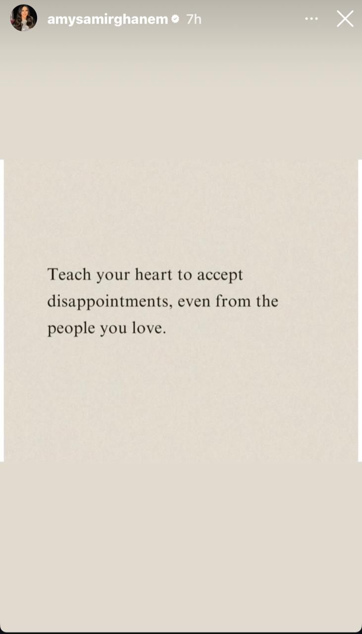 رصد موقع تحيا مصر ما تم تدواله، حيث نشرت إيمي سمير غانم عبر ستوري إنستجرام عبارة قصيرة لكنها تحمل في الكثير من المعاني: "أنا لست بخير.. لكن لا بأس"، ثم أتبعتها برسالة أخرى أكثر عمقاً: "علّم قلبك أن يتقبل خيبات الأمل… حتى مع من تحب".