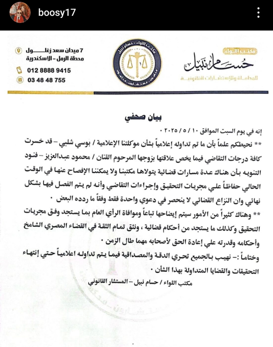 وجاء في بيان بوسي شلبي الذي رصده موقع تحيا مصر أن ما يُشاع حول خسارة بوسي شلبي لجميع القضايا غير دقيق، وأن هناك عدة مسارات قضائية لا تزال منظورة أمام المحاكم ويتولاها مكتب المستشار القانوني، مشيراً إلى أن النزاع القانوني لا يقتصر على دعوى واحدة كما تم الترويج له، وأوضح المكتب أن بعض القضايا لم يُفصل فيها نهائياً بعد، وأنه لا يمكن الكشف عن تفاصيلها حالياً حفاظاً على سرية التحقيقات وسير إجراءات التقاضي.