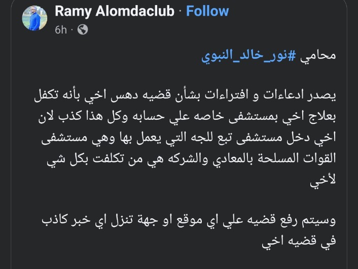 وكان محامي نور خالد النبوي قد أصدر تصريحات إعلامية تفيد بأن موكله قام بتغطية تكاليف علاج المصاب في مستشفى خاص على نفقته الخاصة، في محاولة وفقًا لوصف شقيق الضحية لتلميع صورة المتهم والتقليل من حجم الجريمة، مما جعل شقيق الضحية يؤكد أن الأسرة بدأت في اتخاذ الإجراءات القانونية لملاحقة كل من يروج معلومات كاذبة أو يحاول تزييف الحقائق، وأنها ستطالب بحقها وحق ابنها بالقانون دون أي مساومة أو محاولات للضغط أو التسوية الإعلامية.