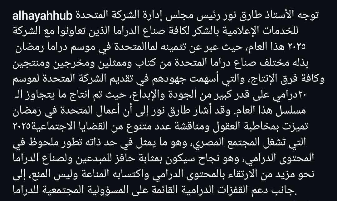 توجّه الأستاذ طارق نور رئيس مجلس إدارة الشركة المتحدة للخدمات الإعلامية، بالشكر والتقدير إلى كافة صنّاع الدراما الذين تعاونوا مع الشركة خلال موسم رمضان 2025، مؤكدًا أن الجهود الجماعية التي بذلها الكتّاب والمخرجون والممثلون والمنتجون وجميع فرق الإنتاج ساهمت في تقديم موسم درامي استثنائي يتمتع بدرجة عالية من الجودة والإبداع.