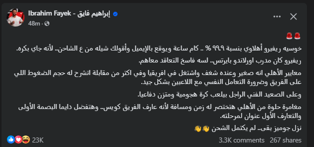 تحيا مصر، وكتب إبراهيم فايق عبر حساهب الرسمي"فيس بوك": خوسيه ريفيرو أهلاوي بنسبة ٩٩.٩ % .. كام ساعة ويوقع بالإيميل وأقولك شيله من على الشاحن، لأنه جاي بكره".