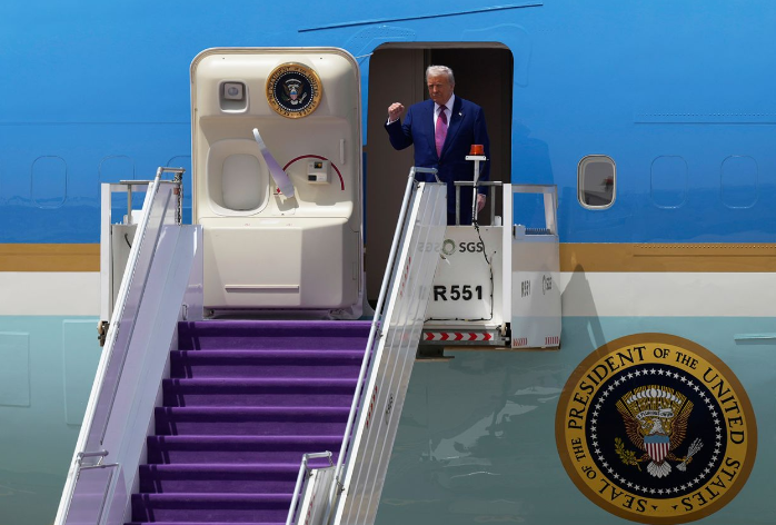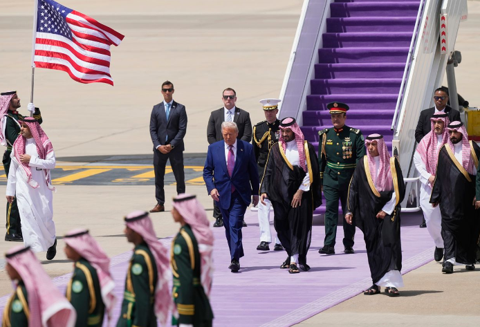 في أولى جولته لمنطقة الشرق الأوسط، وصل الرئيس الأمريكي دونالد ترامب، اليوم الثلاثاء، إلى المملكة العربية السعودية، حيث هبط على متن طائرة الرئاسة الأمريكية (إير فورس وان) على درجات مفروشة بالسجاد باللون البنفسجي، وكان في استقباله ولي العهد الأمير محمد بن سلمان.