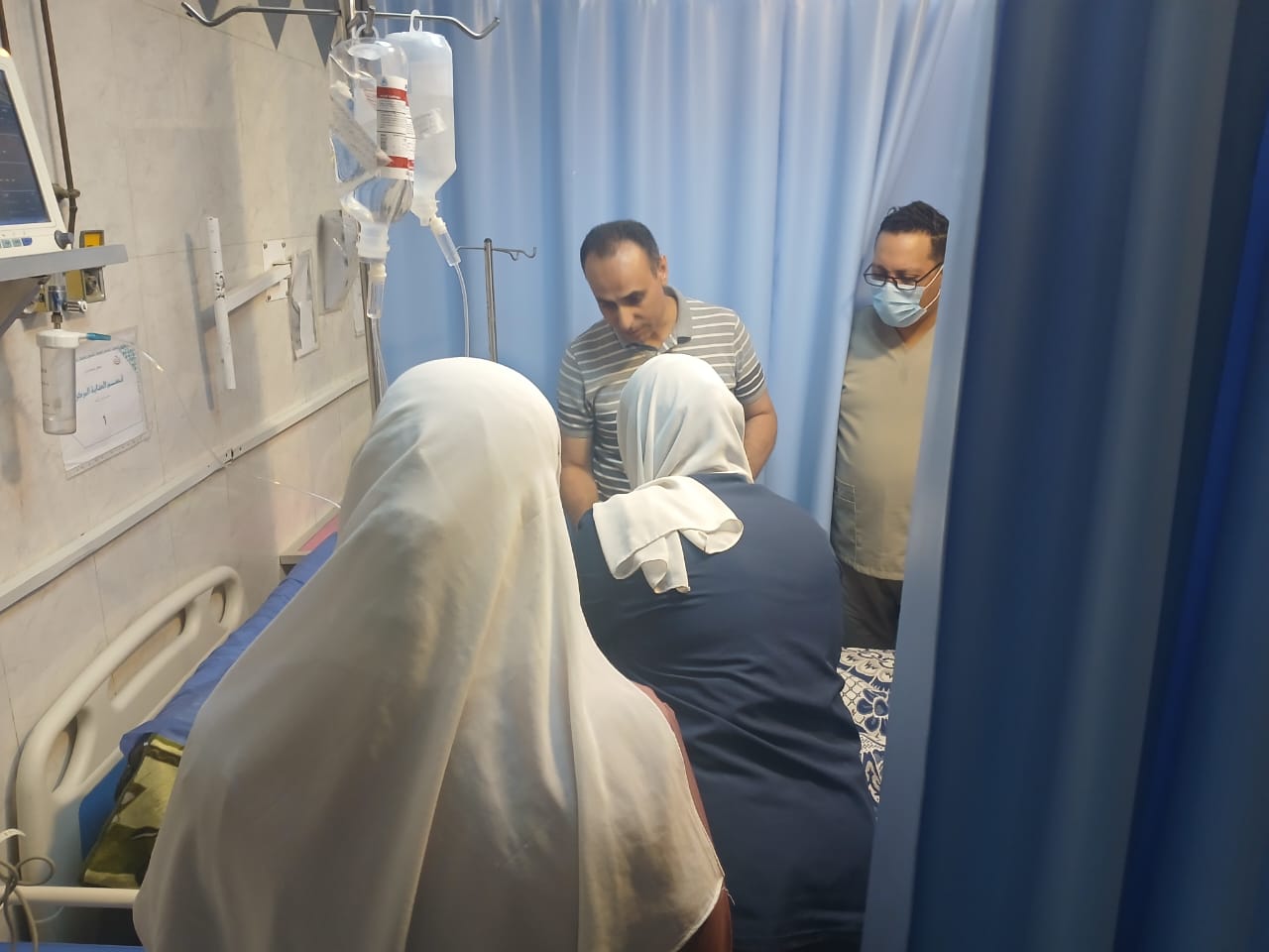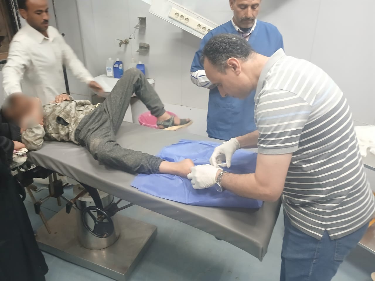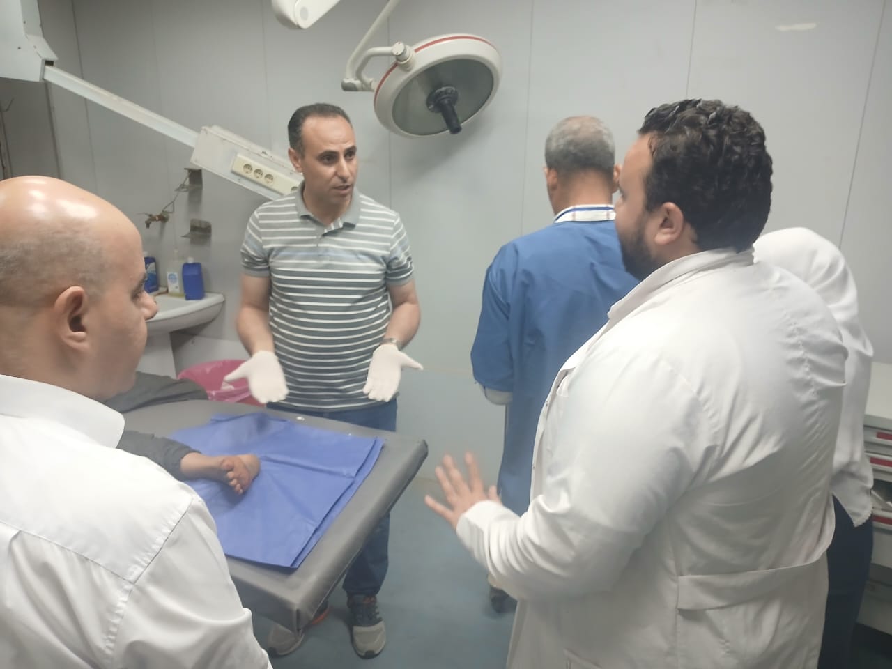 وخلال الجولة تفقد وكيل الصحة ووكيل المديرية الأقسام الطبية المختلفة بالمستشفى، حيث تم المرور على قسم الاستقبال والطوارئ، وتلاحظ وجود تكدس كبير من ذوي المرضى داخل القسم، وغياب بعض الأطباء المكلفين بالسهر في قسم الاستقبال، وهو ما استدعى التدخل الفوري من وكيل الوزارة لتقديم الرعاية الطبية لأحد الأطفال المصابين الذي تردد على الاستقبال، حيث قام الدكتور هاني جميعة بنفسه بإجراء خياطة جراحية للطفل باستخدام خيوط تم توفيرها من صيدلية المستشفى، بعد إحضار أهل الطفل خيط جراحي من خارج المستشفى ظناً منهم بعدم توافرها داخل المستشفى، إلا أنه تم التأكد من وجود الخيوط اللازمة داخل الصيدلية الموحدة للاستقبال والطوارئ والتي تعمل على مدار الـ٢٤ ساعة، وتم إجراء الخياطة باستخدام الخيوط المتوفرة بالمستشفى، وقام أهالي الطفل بإرجاع الخيوط التي تم شراؤها من الخارج، بعد توفيرها من داخل المستشفى.