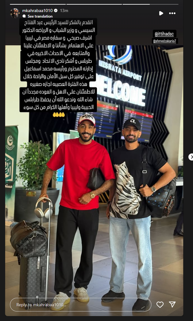 تحيا مصر، وكتب محمود كهربا عبر حسابه الرسمي"إنستجرام":" اتقدم بالشكر للسيد الرئيس عبد الفتاح السيسي ووزير الشباب والرياضة وسفارة مصر فى ليبيا على الأهتمام بشأننا والأطمئنان علينا والمتابعة فى الأحداث الأخيرة فى طرابلس وأشكر نادي الاتحاد وجلس إدارته المحترم ورئيسه محمد إسماعيل، علي توفير كل سبل الأمان والراحة خلال هذه الفترة العصيبة أجازة صغيره للأطمئنان علي الأهلي العودة مجدداً إن شاء الله وندعو الله أن يحفظ طرابلس الحبيبة وليبيا وأهلها الكرام من كل سوء".