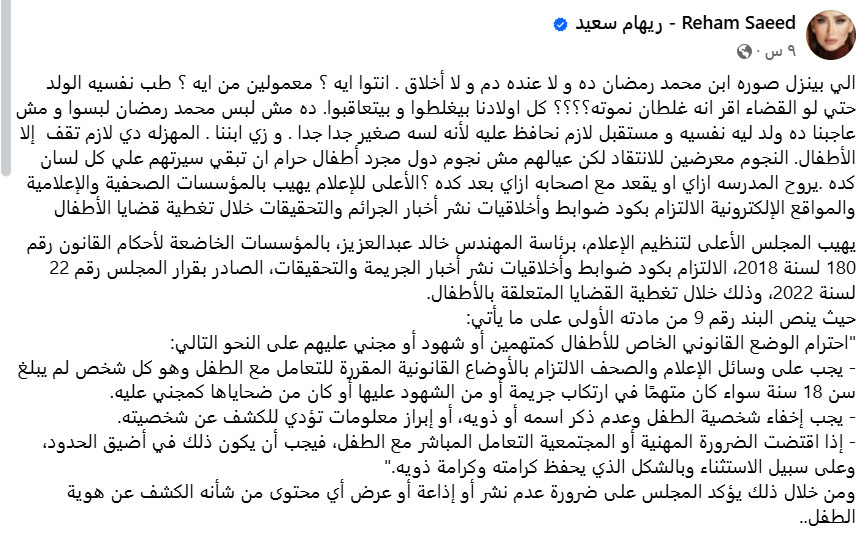 واختتمت ريهام سعيد حديثها بمناشدة للمؤسسات الإعلامية قائلة: " أناشد الأعلى للإعلام وكل المنصات بالالتزام بكود النشر وعدم تعريض الأطفال للتشهير.. الأطفال خط أحمر، وده مش مجرد التزام قانوني بس، ده واجب إنساني تجاه جيل لسه بيتشكل وبيتأثر".