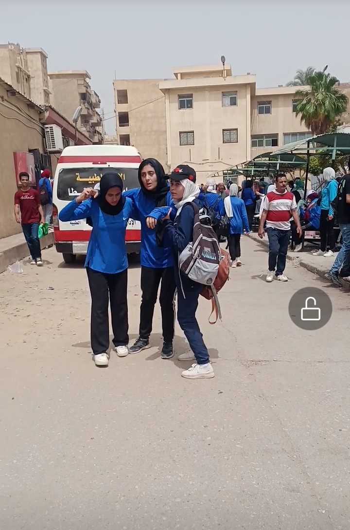 وآخرين من طالبات الفرقة الأولى بكلية التربية الرياضية مصابين بإجهاد حرار، حنان احمد سليمان 19 عاما، حنين محمد البرنس19 عاما، مياده هلال معروف 19 عاما، شروق شوقى الشربى 19 عاماً، علياء عزت طلب 19 عاما، حبيبه محمد منصور 19 عاما، ناهد محمد حسين 19 عاما، شهد بكر جاد 19 عاما، ساره ابراهيم الفخرانى 19 عاما، شرين على الطنطاوي 19 عاما، منه صالح الشاذلى19 عاماً، مى محمد الحلوانى 19 عاما، شرين الصاوى على 19 عاما، داليا جمال عبدالعليم 19 عاما، رنا حاتم الرهوان 19 عاما.