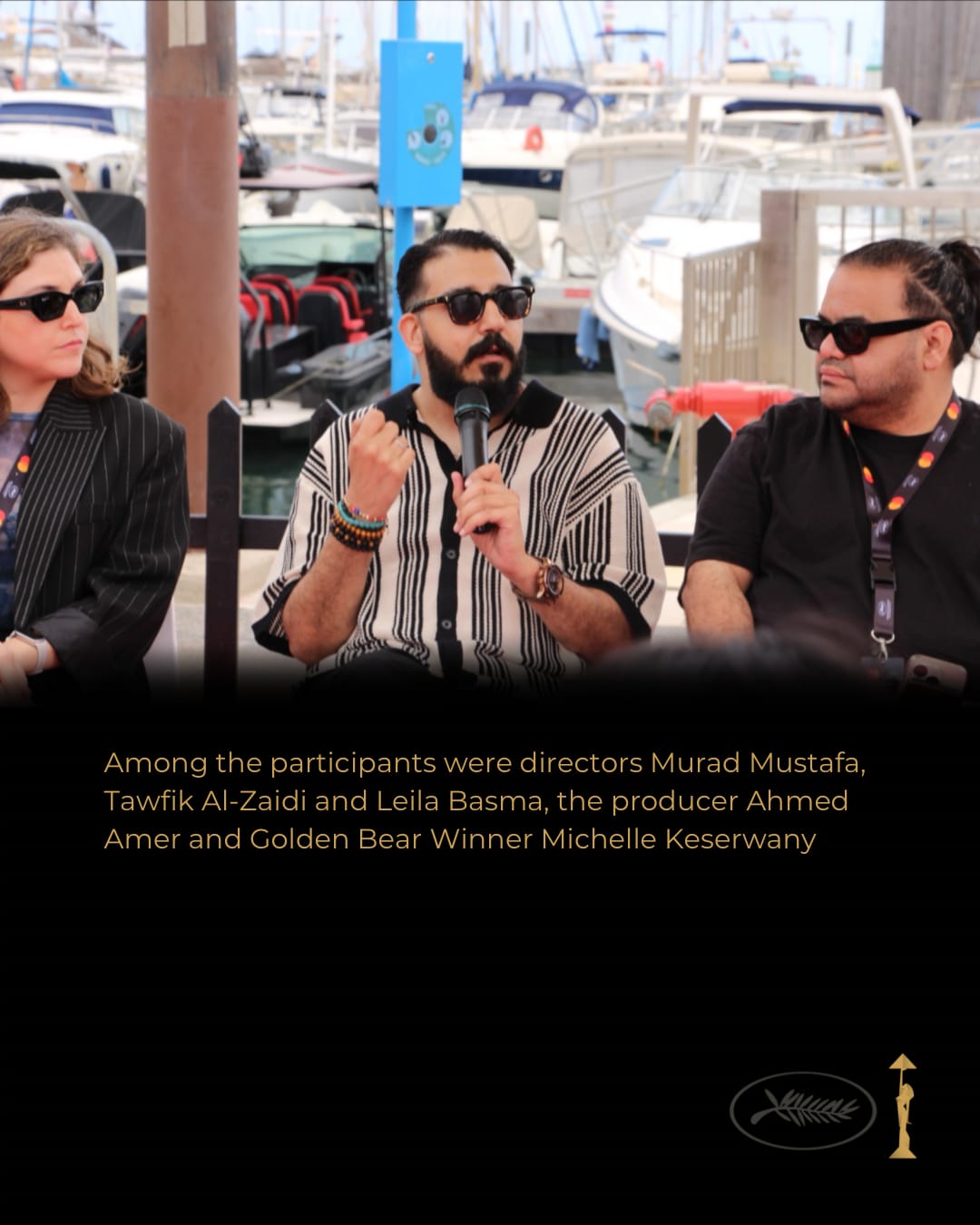 شارك في الجلسة كل من المخرج المصري مراد مصطفى، مخرج فيلم "عائشة لا تستطيع الطيران"، الذي يُعرض هذا العام في مهرجان كان، وقد سبق له أن عرض فيلمه القصير "عيسى" في أسبوع النقاد عام 2023، حيث حصد عدة جوائز، وتُسجل مشاركة "عائشة لا تستطيع الطيران" أحدث مشاركة مصرية في المسابقة الرسمية بعد تسع سنوات من فيلم "اشتباك"، والمنتج أحمد عامر، الذي شارك في إنتاج "عائشة لا تستطيع الطيران" وكذلك شارك في إنتاج الفيلم الفلسطيني "كان ياما كان في غزة"، الذي يُعرض أيضًا هذا العام في كان، من إخراج الأخوين ناصر وطرزان. ويُعتبر الفيلم جزءًا من الحركة السينمائية الفلسطينية الجديدة.