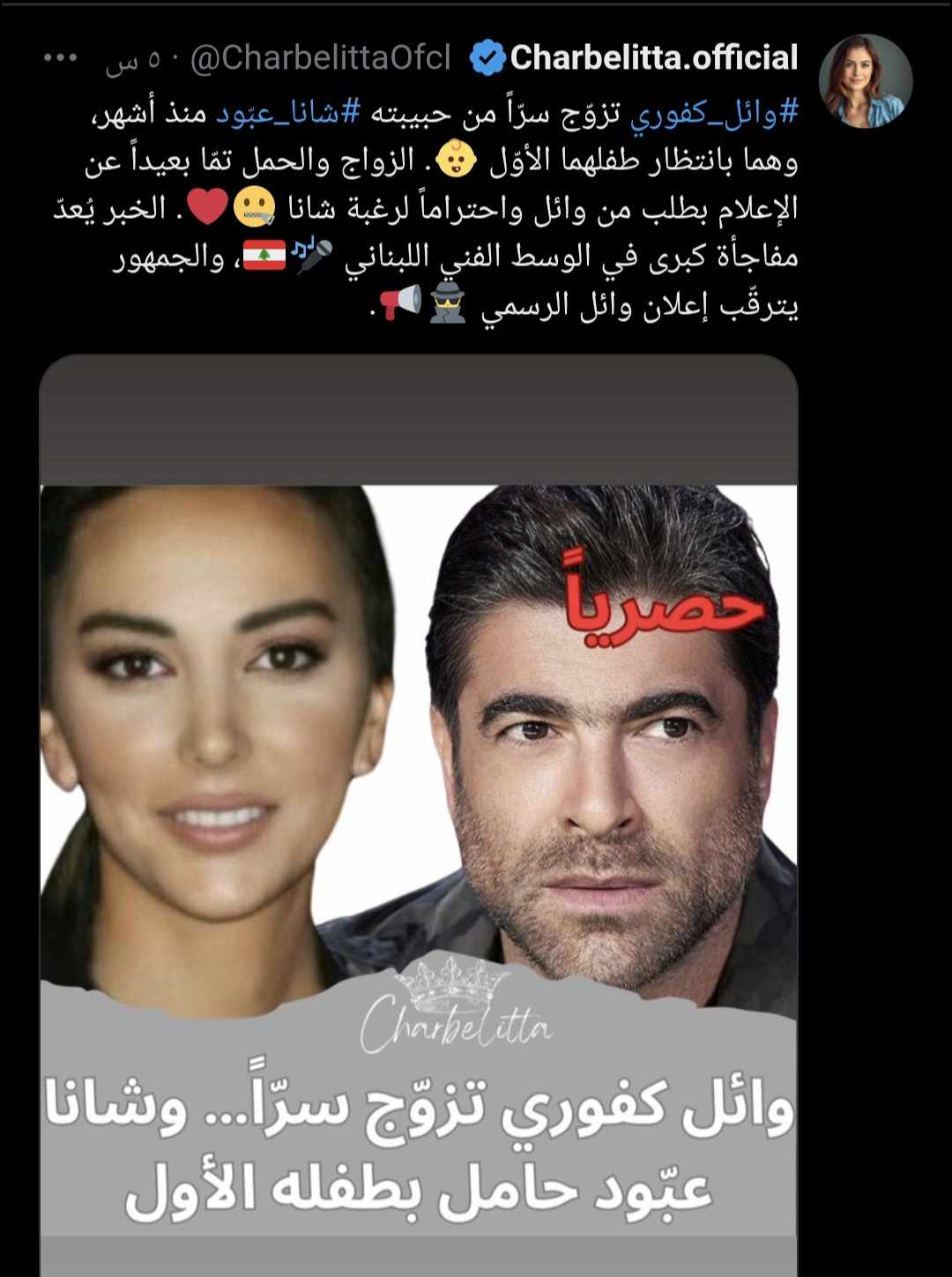 أثارت الإعلامية اللبنانية شاربليتا حالة من الجدل الواسع على مواقع التواصل الاجتماعي بعد كشفها عن مفاجآت تتعلق بحياة النجم اللبناني وائل كفوري الشخصية، حيث صرّحت في تصريحات إعلامية مثيرة أن الفنان الشهير تزوج سرًا من حبيبته اللبنانية شانا عبود منذ عدة أشهر، دون أن يعلن الخبر رسميًا للجمهور أو وسائل الإعلام.