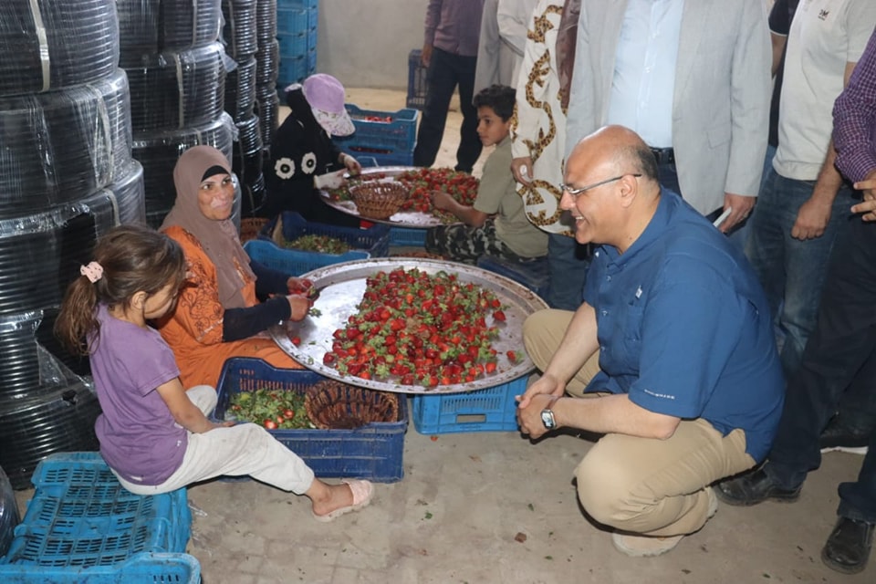واستمعَّ "المحافظ" ومُرافقوه إلى شرح مُفصل لمراحل زراعة وحصاد محصول الفراولة بالمزرعة التي تبلُغ مساحتها ١٠ فدان وتتم الزراعة بإستخدام أحدث الطُرق والتقنيات والتجهيز وبدون مبيدات، بما يضمن مُعالجة الفراولة بشكل يُحافظ على جودتها ونضارتها بالإستعانة بفرق مدربة ومُختصين في الزراعة والإنتاج، مما يُساهم في حماية البيئة وتحقيق التنمية المُستدامة، من خلال إستخدام التقنيات الحديثة للزراعة التي تعمل على تحقيق التوازن بين الإنتاج والإعتناء بالبيئة مع التركيز على الجودة والإبتكار، وتعزيز الإقتصاد المحلي وتلبية إحتياجات السوق العالمية من الفراولة.