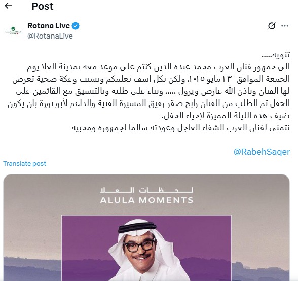 وجاء بيان روتانا عبر حسابها الشخصي بموقع تبادل الصور والفيديوهات اكس الذي كان يعرف سابقاً بأسم "تويتر"، جاء في البيان كالأتي: تنويه إلى جمهور فنان العرب محمد عبده الذين كنتم على موعد معه بمدينة العلا يوم الجمعة الموافق ٢٣ مايو ٢٠٢٥، ولكن بكل اسف نعلمكم وبسبب وعكة صحية تعرض لها الفنان وبإذن الله عارض ويزول، وبناءً على طلبه وبالتنسيق مع القائمين على الحفل تم الطلب من الفنان رابح صقر رفيق المسيرة الفنية والداعم لأبو نورة بان يكون ضيف هذه الليلة المميزة لإحياء الحفل.. نتمنى لفنان العرب الشفاء العاجل وعودته سالمًا لجمهوره ومحبيه.