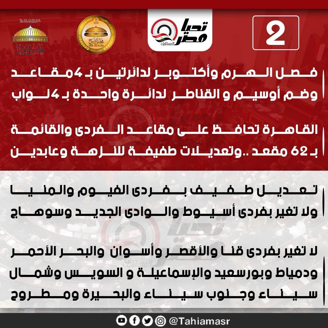 هذه هي التغييرات الجديدة التي وافقت عليها لجنة الشئون التشريعية على مستوى قانون مجلس النواب. أما فيما يتعلق بقانون تقسيم الدوائر، فمن حيث المبدأ لم تشهد مقاعد مجلس النواب أي زيادة على مستوى المقاعد بشكل كامل، ولكن شهدت إعادة توزيع ورسم لبعض الدوائر وبعض المقاعد على مستوى الدوائر الفردية. وكان أبرزها محافظة الإسكندرية: التي شهدت انخفاضاً في عدد المقاعد من ١٦ مقعداً إلى ١٥ مقعداً ومحافظة بني سويف: التي ارتفع عدد مقاعدها من ٨ مقاعد إلى ٩ مقاعد.