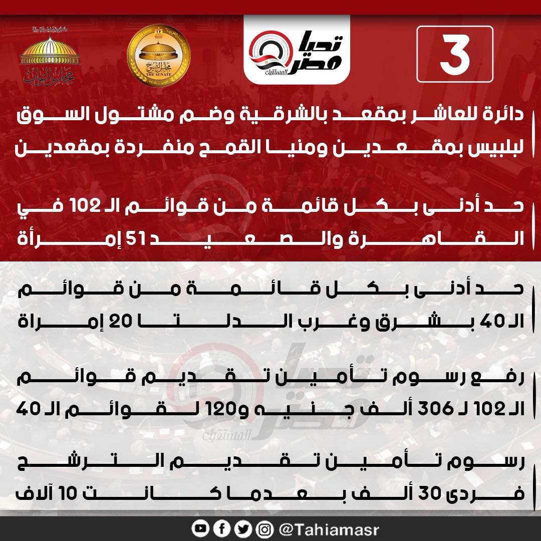 الـ ٥٠٪ المخصصة للقوائم ستكون مقسمة على ٤ دوائر بقوائم، بواقع ١٠٢ مقعداً لقائمتين و٤٠ مقعداً لقائمتين، بخلاف الوضع الحالي الذي كان يتضمن ١٠٠ مقعد لقائمتين و٤٢ مقعداً لقائمتين. على أن تكون القائمة المكونة من ١٠٢ مقعداً بحد أدنى ٥١ مقعداً للمرأة، والقائمة المكونة من ٤٠ مقعداً بحد أدنى ٢٠ مقعداً للمرأة. بالإضافة إلى ١٤٣ دائرة للمقاعد الفردية وذلك لـ ٥٠٪ الأخرى. كما تم رفع قيمة التأمين لتقديم أوراق الترشح، حيث أصبحت ٣٠ ألف جنيه لمرشحي الفردي (بعد أن كانت ١٠ آلاف جنيه)، و٣٠٦ آلاف جنيه للقائمة المكونة من ١٠٢ مقعداً (بعد أن كانت ١٠٠ ألف جنيه)، و١٢٠ ألف جنيه للقائمة المكونة من ٤٠ مقعداً (بعد أن كانت ٤٢ ألف جنيه).