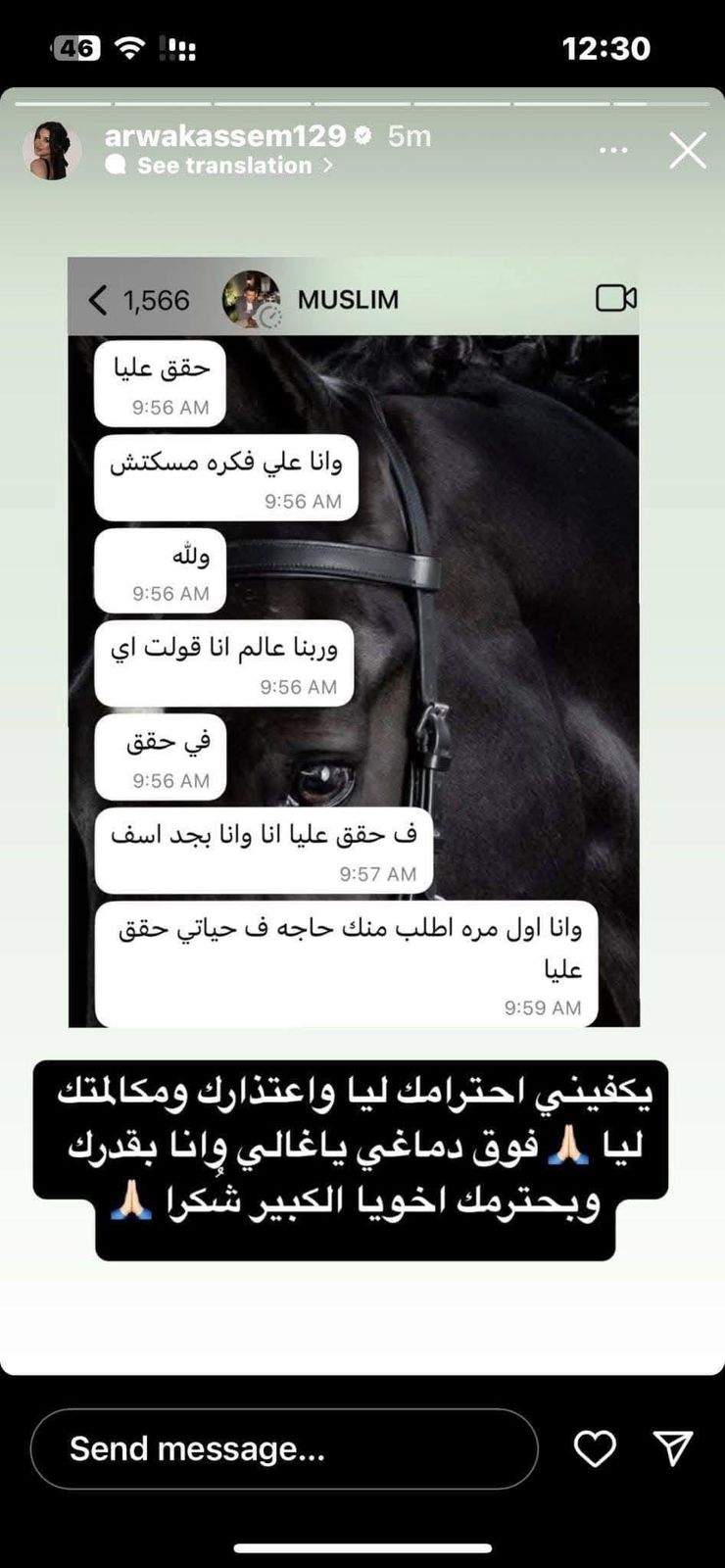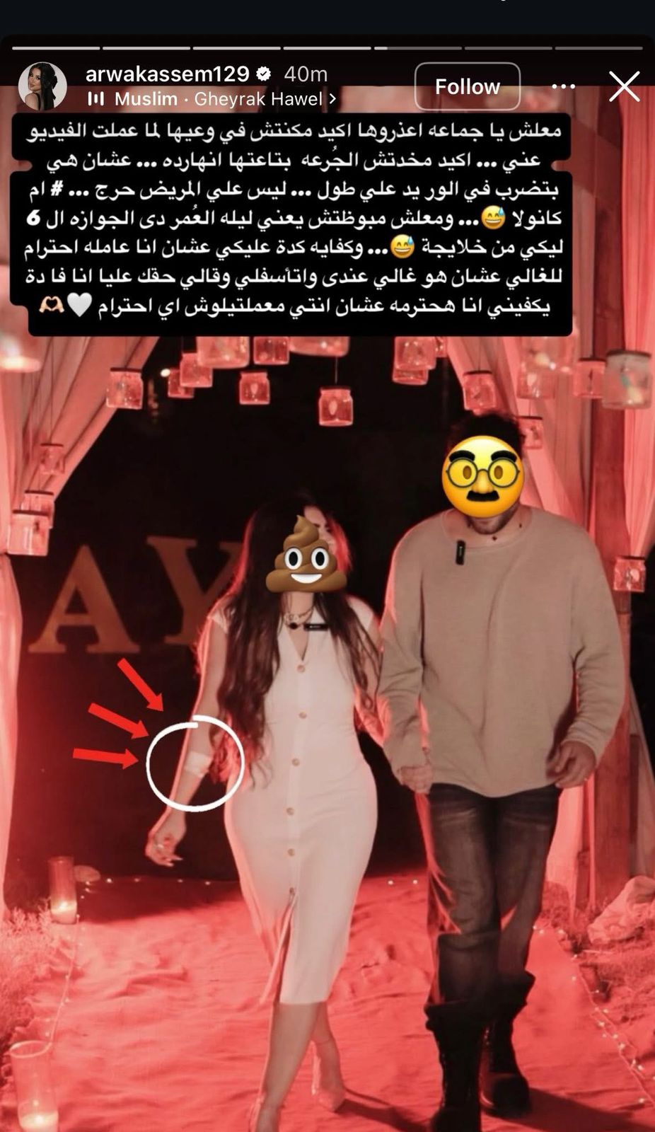 ردت البلوجر أروى قاسم على تصريحات زوجة مسلم، بنشر محادثة بينها وبين المطرب، اعتذر فيها عن الموقف الذي بدر خلال حفل الزفاف، حيث كتب لها: حقك عليا وأنا مسكتش، وربنا العالم أنا قولت إيه، في حقك أنا أسف.