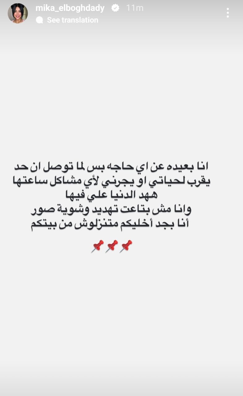 وكتبت ميكا البغدادي في منشورها الذي رصده موقع تحيا مصر: أنا بعيدة عن اي حاجة بس لما توصل أن حد يقرب لحياتي أو يجرني لأي مشاكل ساعتها ههد الدنيا على فيها وأنا مش بتاعت تهديد وشوية صور أنا بجد أخليكم متنزلوش من بيتكم.