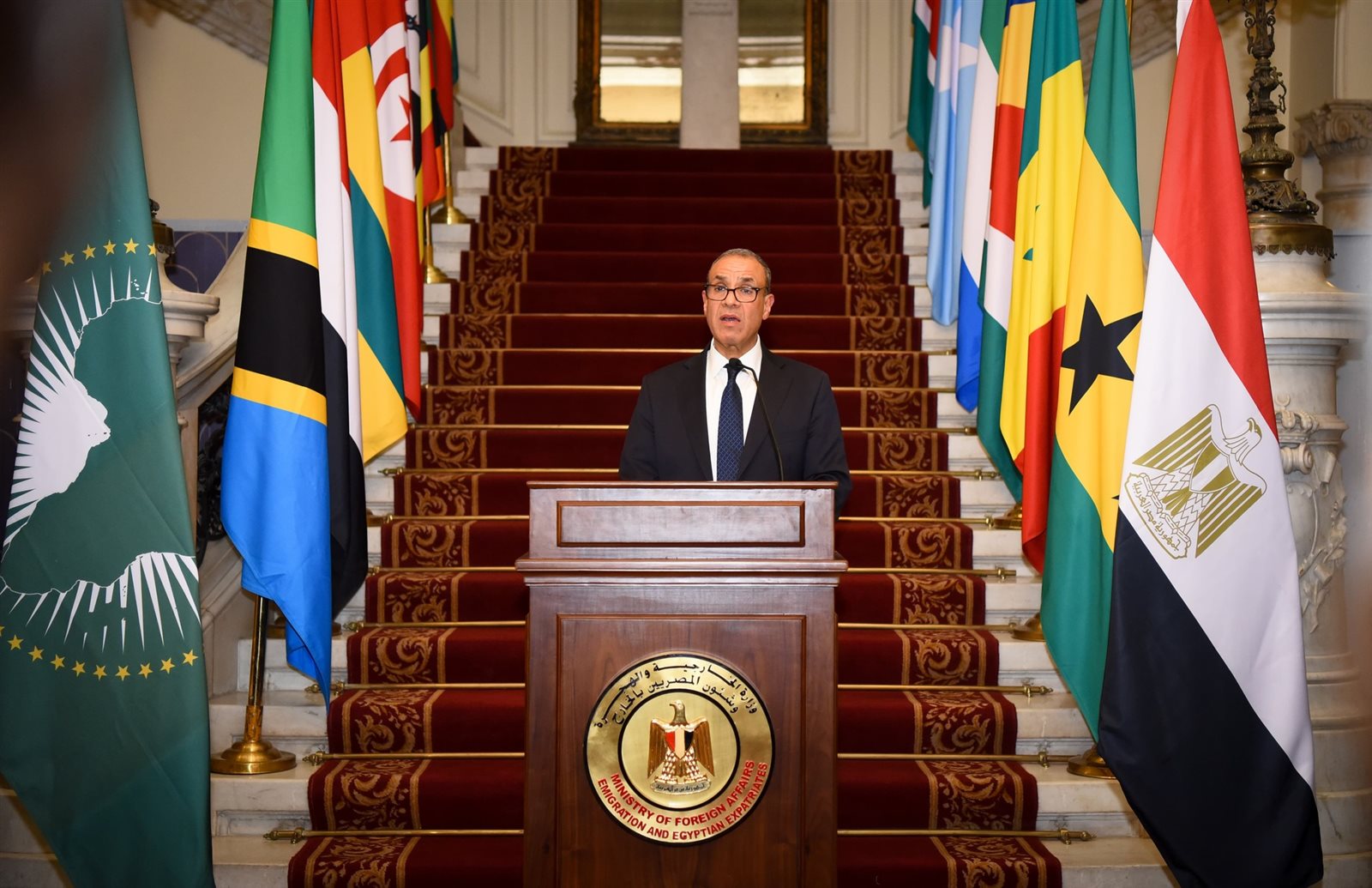 وجاء ذلك خلال كلمة له في فعالية نظمتها وزارة الخارجية والهجرة احتفالاً بيوم إفريقيا، حيث حضر الاحتفال د. بدر عبد العاطى، والمهندس كريم بدوى وزير البترول والثروة المعدنية، ومحمد جبران وزير العمل، ووزراء الخارجية السابقون عمرو موسى ومحمد كامل عمرو ومحمد العرابى وسامح شكرى، و محمد فائق وزير الإعلام الأسبق، والسفيرة مشيرة خطاب رئيس المجلس القومي لحقوق الإنسان، والمستشار أمل عمار رئيس المجلس القومى للمرأة، وحازم عمر رئيس لجنة الشئون الخارجية والعربية والأفريقية بمجلس الشيوخ، والنائب شريف الجبلي رئيس لجنة الشئون الافريقية بمجلس النواب، وأحمد الوكيل رئيس اتحاد الغرف التجارية، والسفراء الأفارقة المعتمدين بالقاهرة.