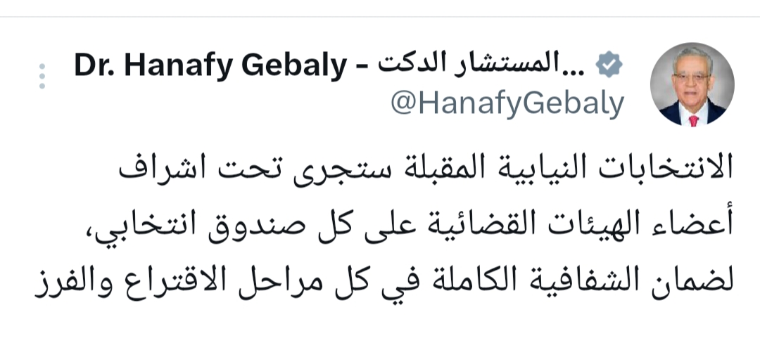 طمأن المستشار الدكتور حنفي جبالي رئيس مجلس النواب الشعب المصري بأن الانتخابات النيابية المقبلة ستجري تحت إشراف أعضاء الهيئات القضائية.