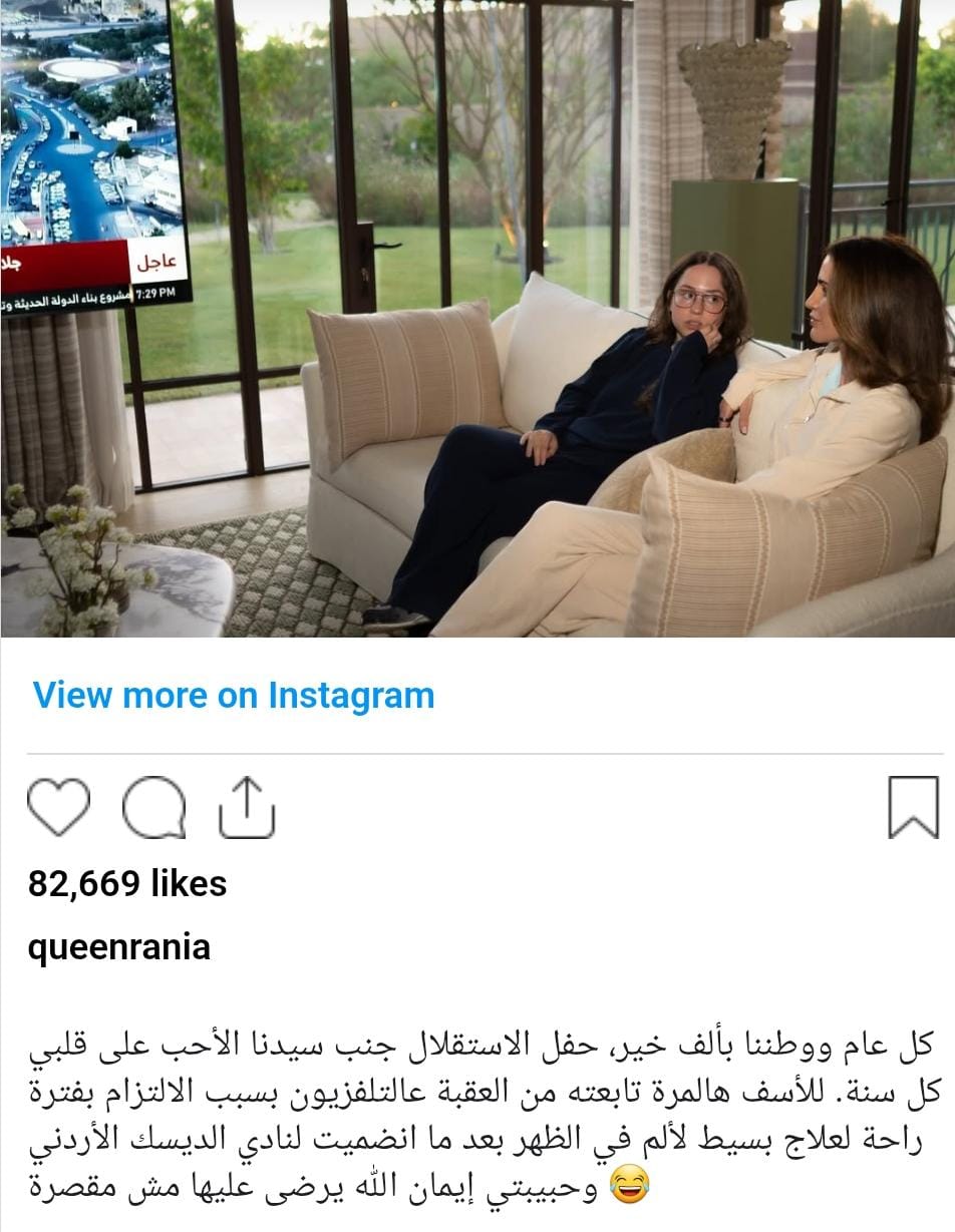 نشرت الملكة رانيا صورة جمعتها بابنتها الأميرة إيمان خلال متابعتهما الحفل عبر شاشة التلفزيون من مدينة العقبة، وكتبت: "كل عام ووطننا بألف خير، حفل الاستقلال جنب سيدنا الأحب على قلبي كل سنة، للأسف هالمرة تابعته من العقبة عالتلفزيون بسبب الالتزام بفترة راحة لعلاج بسيط لألم في الظهر بعد ما انضممت لنادي الديسك الأردني، وحبيبتي إيمان الله يرضى عليها مش مقصرة".