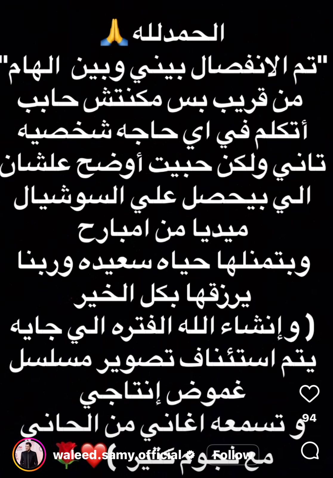 وكتب وليد سامي عبر حسابه الرسمي بـ موقع تبادل الصور والفيديوهات على انستجرام قال فيه: الحمد لله.. تم الانفصال بيني وبين إلهام من قريب، بس مكنتش حابب أتكلم في أي حاجة شخصية تاني، ولكن حبيت أوضح عشان اللي بيحصل على السوشيال ميديا من أقاويل.. أتمنى لها حياة سعيدة وربنا يرزقها بكل الخير، وإن شاء الله الفترة اللي جاية يتم استئناف تصوير مسلسل غموض إنتاجي، ونسمع أغاني من الحاني مع نجوم كتير.