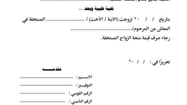 -نموذج طلب صرف منحة الزواج، حيث يمكن الحصول عليه من المكتب التأميني، أو تحميله من الموقع الرسمي للتأمينات.
