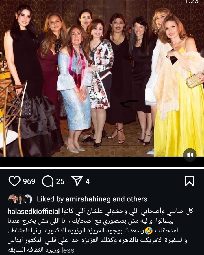 وكتبت هالة صدقي عبر حسابها على مواقع التواصل الاجتماعي وفقًا لما يرصده موقع تحيا مصر: "كل حبايبي وأصحابي اللي وحشوني علشان اللي كانوا بيسألوا، وليه مش بتتصوري مع أصحابك، أنا اللي مش بخرج عندنا امتحانات"، في إشارة إلى انشغالها العائلي، حيث تولي اهتماماً كبيراً بمتابعة امتحانات أولادها، وهو ما منعها من الظهور في الصور التي يتداولها أصدقاؤها من الوسط الفني، وأضافت صدقي في تعليقها أنها كانت سعيدة جدًا بلقاء شخصيات بارزة في نفس التجمع، أبرزهن الوزيرة الدكتورة رانيا المشاط، والسفيرة الأمريكية بالقاهرة، وكذلك الدكتورة إيناس عبد الدايم، وزيرة الثقافة السابقة، ما أضفى على اللقاء طابعًا مميزًا يجمع بين الفن والدبلوماسية والثقافة.