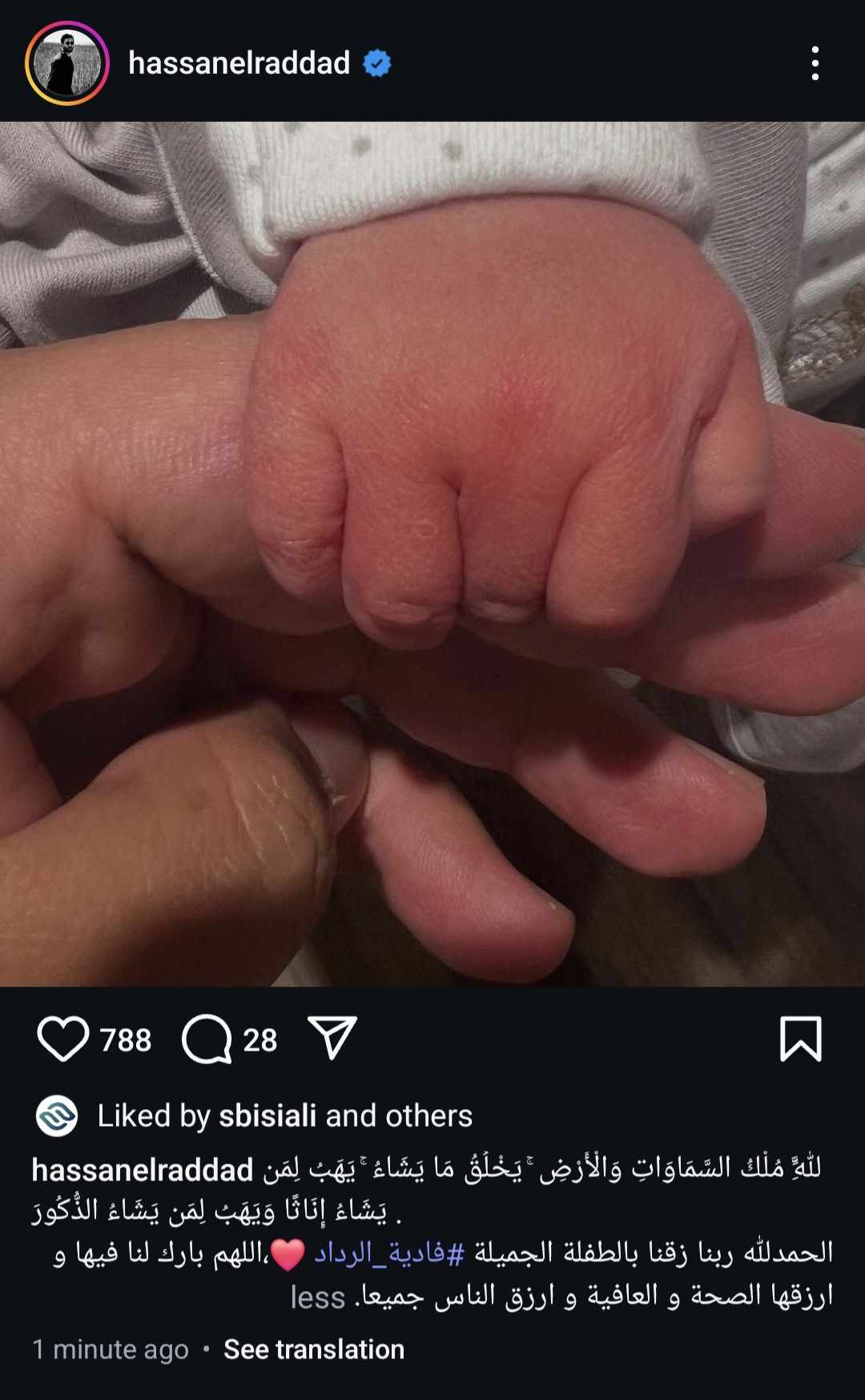 وكتب حسن الرداد في منشوره الذي يرصده موقع تحيا مصر: لِّلَّهِ مُلْكُ السَّمَاوَاتِ وَالْأَرْضِ ۚ يَخْلُقُ مَا يَشَاءُ ۚ يَهَبُ لِمَن يَشَاءُ إِنَاثًا وَيَهَبُ لِمَن يَشَاءُ الذُّكُورَ.. الحمدلله ربنا زقنا بالطفلة الجميلة فادية الرداد، اللهم بارك لنا فيها و ارزقها الصحة و العافية و ارزق الناس جميعا.